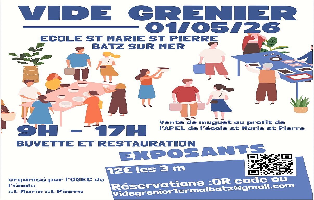 L’OGEC de l’école Sainte-Marie/Saint-Pierre organise la 2e édition de son vide-greniers. Venez nombreux chiner, vendre et passer un moment convivial en famille ou entre amis. Une vente de muguet au profit de l’APEL de l’école aura lieu également place du Garnal.